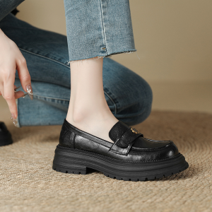 Thick-soled camellia loafers women’s 2025 new vintage brown casual round toe pumps british small leather shoes